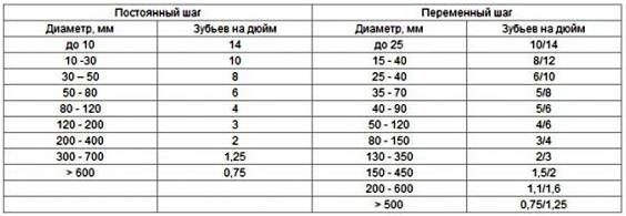 Шаг зуба определяется как постоянный или переменный. Первый вариант подойдёт для работы с заготовками в большом объеме. Переменный шаг позволит получить идеально чистый срез. В таблице ниже представлена информация о том, как подобрать нужный показатель при работе с проектом сплошного сечения.