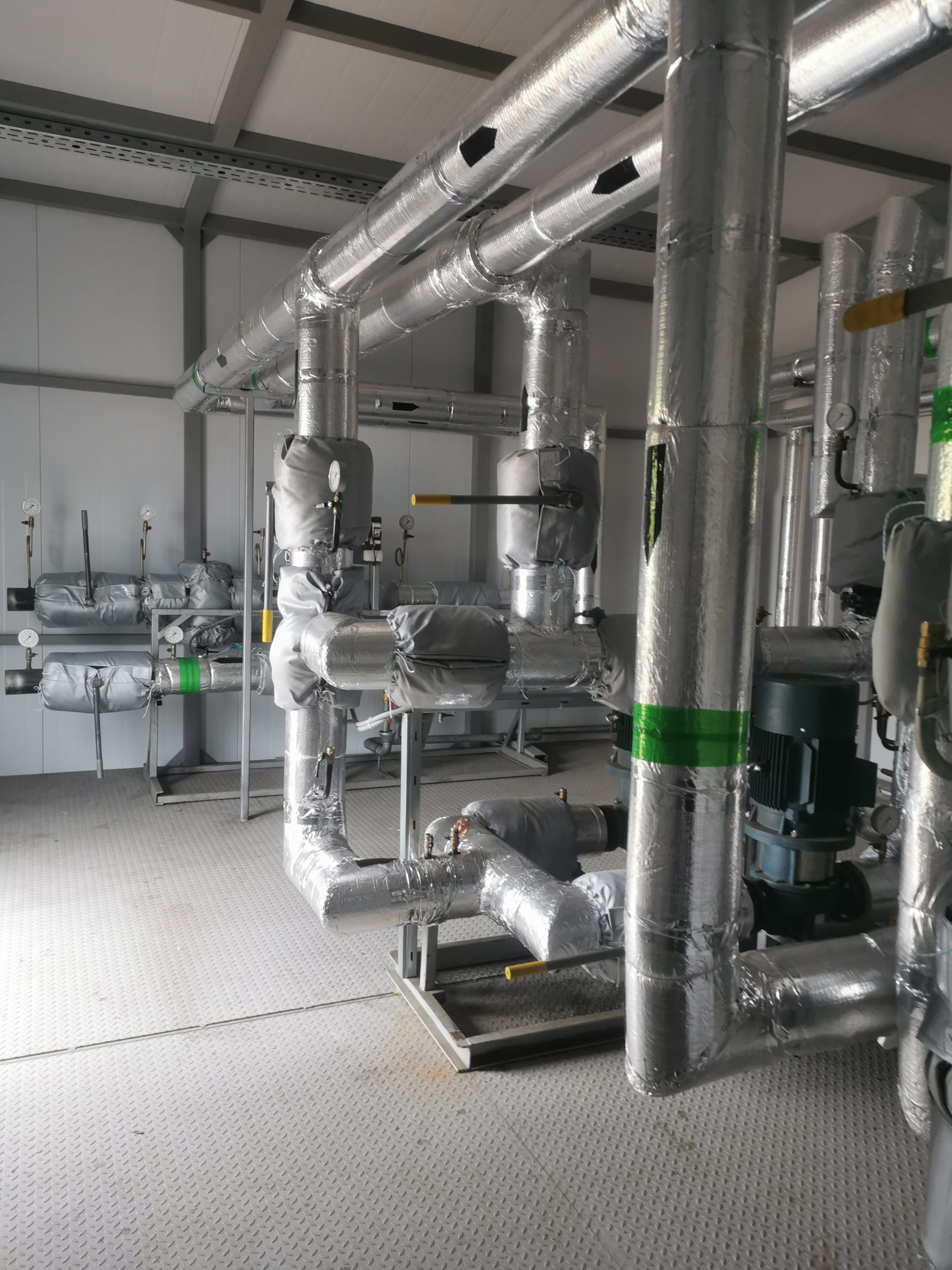 Стены и кровля выполнены из клееной PIR-панелей толщиной 80 и 120мм. Доставка ЦТП выполнялась в несколько этапов (модулями 8х4м) с привлечением спецтехники и группы сопровождения.